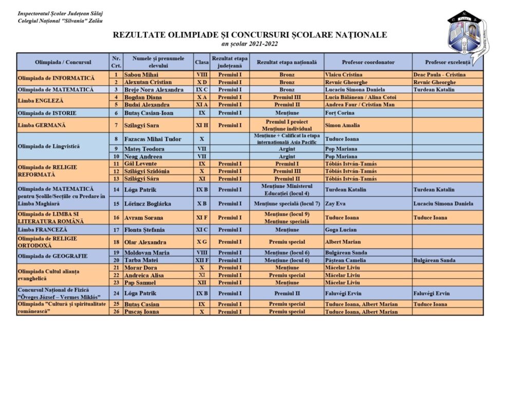 Colegiul Național ”Silvania” a adunat un palmares de 26 de elevi cu rezultate deosebite la etapa națională a celor mai ”cu greutate” olimpiade școlare organizate în acest an.