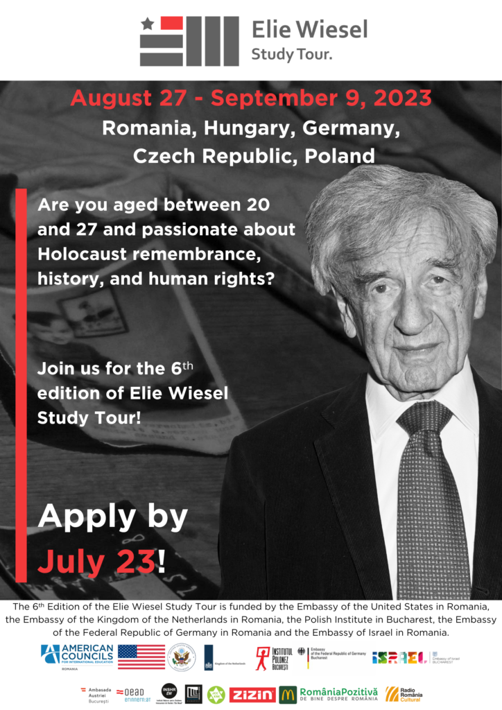 Programul tematic Elie Wiesel Study Tour, aflat la cea de-a șasea ediție, se va desfășura în perioada 27 august -9 septembrie. Este finanțat de Ambasada Statelor Unite în România, Ambasada Regatului Țărilor de Jos în România, Institutul Polonez din București, Ambasada Republicii Federale Germania în România și Ambasada Statului Israel în România și își propune să ofere studenților interesați de tematica drepturilor omului și de istoria Holocaustului ocazia de a înțelege mai multe despre aceste subiecte și de a aprofunda