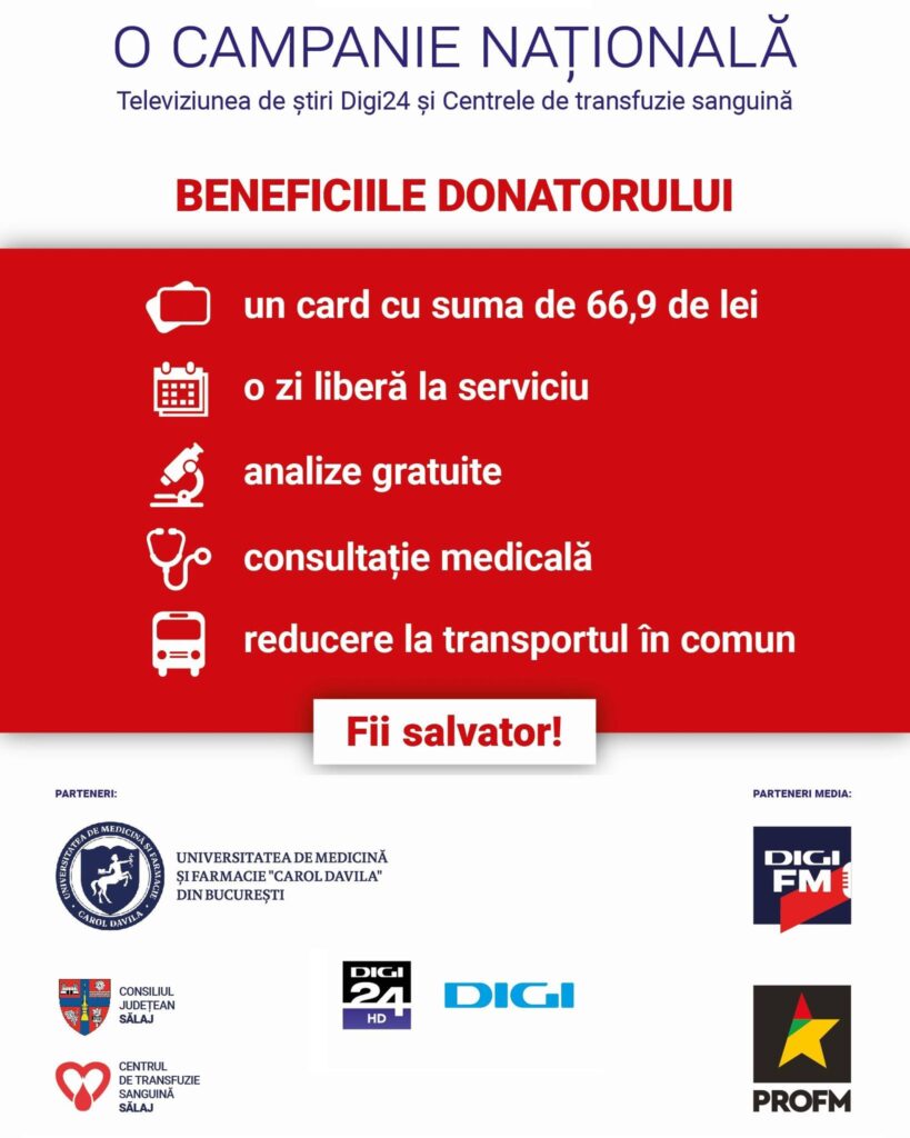 Donează şi tu sânge, în cadrul campaniei naţionale “Avem acelaşi sânge”, iniţiată de Digi24, în colaborare cu centrele de transfuzii din țară şi autoritățile locale, care va ajunge vineri la Zalău.