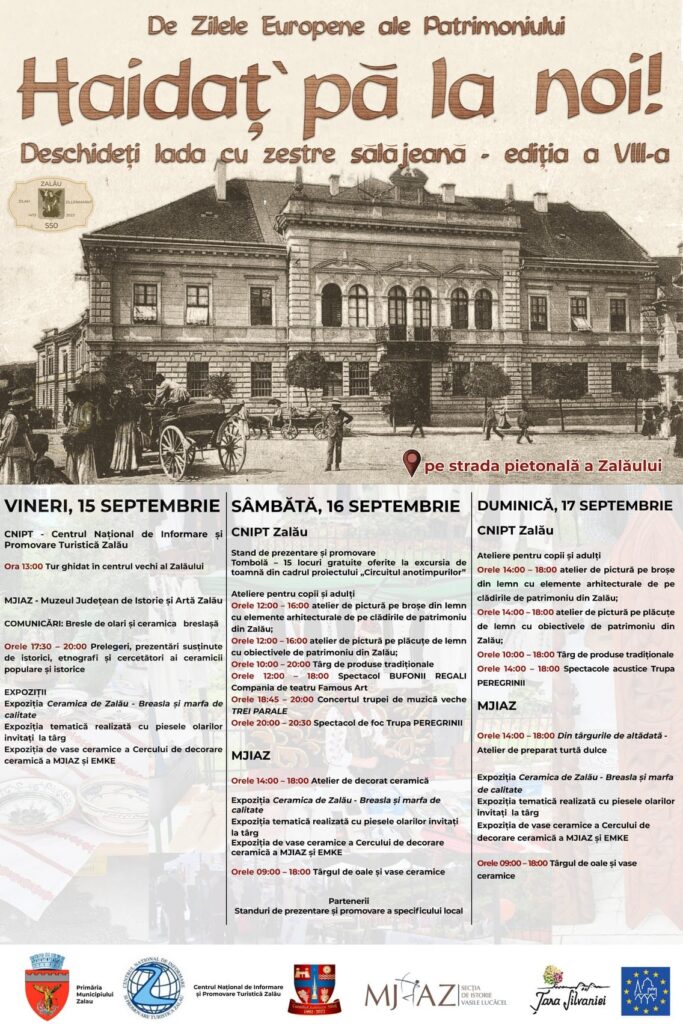 Muzeul Județean de Istorie și Artă Zalău participă la cea de a VIII-a ediție a evenimentului ”Haidaț` pă la noi”, aducând în prim-plan tradiția și măiestria olarilor, printr-o serie de comunicări științifice, expoziții, ateliere și un târg de olari. Evenimentul are loc în perioada 15-17 septembrie, în noua zonă pietonală a municipiului Zalău.
