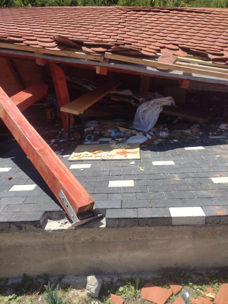 Stâlpii sunt insuficient ancorați, aici e baiul. Fără să lucrez în domeniu, la așa acoperiș greu, eu aș fi folosit ca stâlpi țeavă din oțel fi 80 mm, încastrată în beton. Garantez că putea să vină furtuna și nu se întâmpla nimic ! Oare cine a fost dorelul sălăjan care a realizat ” foișorul” ?