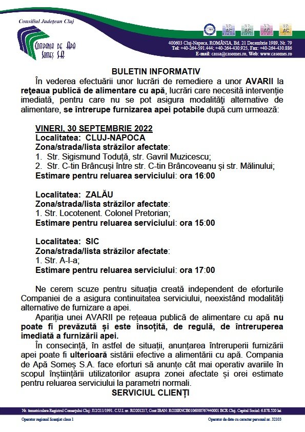 Anunț privind întreruperea furnizării apei potabile ca urmare a unor avarii, valabil pentru data de 30 Septembrie 2022 în municipiile Cluj-Napoca, Zalău și localitatea Sic (anunț actualizat)