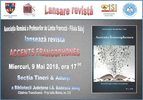 Asociatia Româna a Profesorilor de Limba Franceza (ARPF) – Filiala Salaj lanseaza primul numar al revistei „Accents Francophones” maine, miercuri 9 mai, la ora 17.00, la Biblioteca Judeteana „Scipione Badescu” Zalau, cladirea Transilvania.Aceasta revista francofona anuala are ca scop sa dea posibilitatea profesorilor din Salaj, precum si din judetele învecinate, sa-si exprime parerile despre diverse subiecte de interes profesional: metodica, literatura, gramatica, cultura, civilizatie, poezie, istorie etc.