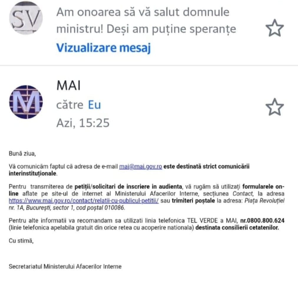 „Așa cum anticipase încă din primele rânduri ale scrisorii adresate ministrului Lucian Bode, Silviu, colegul nostru, a primit un ŕăspuns prompt…nu e bună adresa de mail, pe care tot pe site-ul MAI a găsit-o:)) Asta pățesc tinerii polițiști care îndrăznesc să creadă că sistemul se poate schimba, că sunt ascultați, că pot contribui la îmbunătățirea instituțională. Au ajuns polițiștii din stradă să cerșească decență, normalitate și echipament adaptat nevoilor străzii! P.S. Nu trăiești în România anului 2021 dacă nu trebuie să trimiți o petiție prin poștă, în trei exemplare, conformate cu originalul și semnate pe fiecare pagină, într-un dosar cu șină”, spun, ironic, reprezentanții Europol.