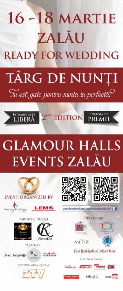 S.C. Ready Business Zalau S.R.L. te invita sa vizitezi târgul de nunti Ready for Wedding aflat la a doua editie, singurul care va avea loc în acest an în judet. Manifestarea are loc la Glamour Halls Events Zalau. Îti garantam ca aici vei gasi totul într-un singur loc, repede si la cele mai avantajoase preturi din piata!