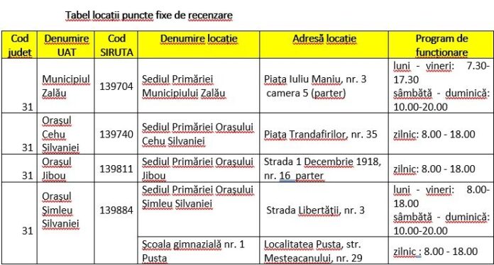 Punctul fix de recenzare de la sediul Primăriei Oraşului Cehu Silvaniei este deschis zilnic între orele 8.00 – 18.00.