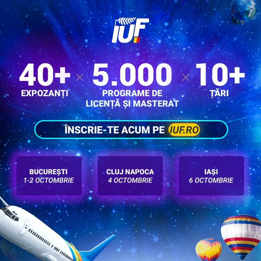 În data de 4 octombrie, la IUF – The International University Fair, vor fi prezenți reprezentanți ai universităților din Olanda, Belgia, Germania, Elveția, Franța, Danemarca, România, Suedia sau Austria. Toți vizitatorii, fie că sunt elevi de liceu, studenți, părinți sau profesori, au ocazia să discute direct cu reprezentanții universităților internaționale, fără să fie nevoie de intermediari; să afle ce program de studiu li se potrivește gratuit, cu ajutorul consilierilor educaționali EDMUNDO, Universalio, Edmerica și Opțiuni de carieră prezenți la eveniment; să primească informații complete despre admitere, burse și surse de finanțare pentru programul de studiu de interes; să discute direct cu studenții români care au plecat la studii în strainătate pentru a afla cum este viața de student internațional; să afle în timp redus oferta educațională expusa de universități din Europa, Asia sau America.