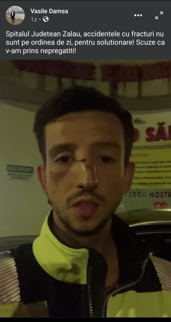 Pe rețelele de socializare, pacientul Vasile Damșa a publicat marți noaptea un live din fața UPU-SMURD Zalău în care prezenta faptul că a avut un accident rutier, s-a dus la UPU apoi a fost trimis acasă cu recomandarea să se întoarcă a doua zi: ”Mă aflu la Spitalul Județean de Urgență Zalău, în urma unui accident rutier, cu fractură de piramidă nazală. Medicii au concluzionat că pot să merg liniștit acasă. Să mă întorc a doua zi când medicul va fi aicea. Am și diagnosticul – fractură cu deplasare la nivelul piramidei nazale. Data 28.09.2021”, spune pacientul în filmarea publică.