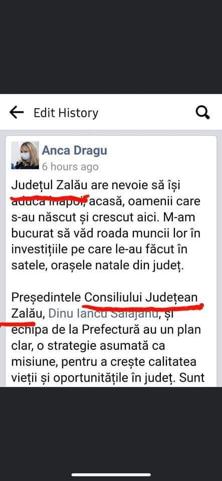„Glumele cu județul Sălaj, care nu ar exista, glume pe care, recunosc, le-am făcut și eu uneori cu Dacian Cioloș, el însuși mândru sălăjean, s-au răzbunat pe mine cu vârf și îndesat. Într-o postare de astăzi, între conferința de presă, drumuri, muzeu, consiliu județean, prefectură, a ieșit <județul Zalău>. Asta, în condițiile în care mă întâlnisem chiar cu președintele Consiliului Județean, Dinu Iancu-Sălăjanu, care poartă cu mândrie numele județului și în buletin – probabil și pentru noi, sudiștii:) De aceea, vă spun din nou, verificat la sursă: Județul Sălaj există!”, a scris Anca Dragu pe pagina sa de Facebook.