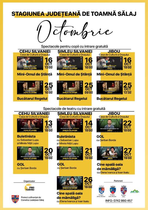 În această toamnă, Asociația Pro Teatru va ajunge în toate orașele din județ. Astfel, 30 de spectacole de teatru vor putea fi văzute gratuit, la Cehu Silvaniei, Șimleu Silvaniei și Jibou.