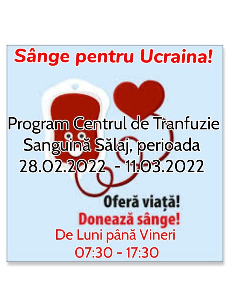 Și Centrul de Transfuzie Sanguină din Zalău va funcționa în baza unui program prelungit. Potrivit informării conducerii Centrului, ”în perioada 28 februarie 2022 – 11 martie 2022, programul Centrului de Transfuzie Sanguină Sălaj va fi de luni până vineri în intervalul orar 07:30 – 17:30”.