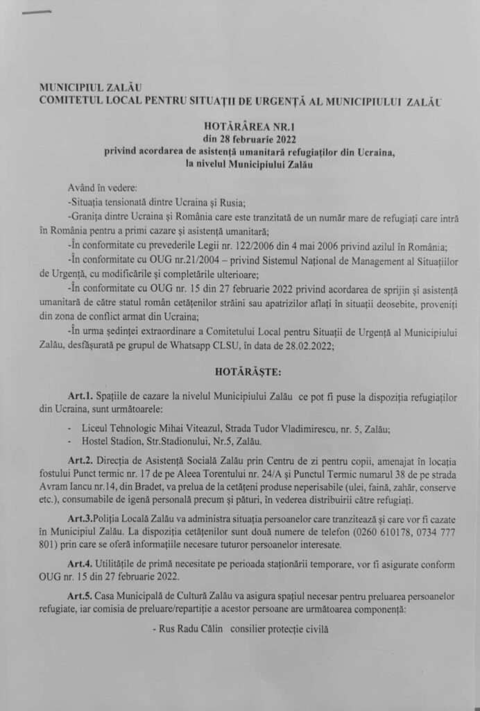 Totodată, Primăria Zalău roagă localnicii care au adus refugiați din Ucraina sau care au cunoștință despre aceste persoane că ar fi ajuns în Zalău și nu au adapost să sune la numerele de telefon puse la dispoziție de Poliția Locală și să ofere informații despre adresă și numărul de contact (adresa din Zalău unde se află refugiații din Ucraina).