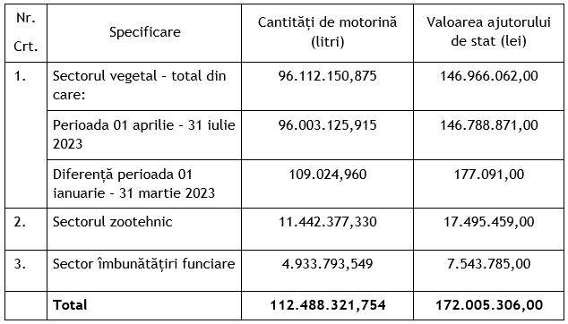 Agenția de Plăți şi Intervenție pentru Agricultură efectuează plata ajutorului de stat la motorina utilizată în agricultură, în perioada 1 aprilie – 31 iulie 2023. Valoarea ajutorului de stat acordat sub formă de rambursare este de 172.005.306 lei și se acordă unui număr de 16.836 beneficiari, pentru cantitatea de 112.488.321,754 litri de motorină determinată.