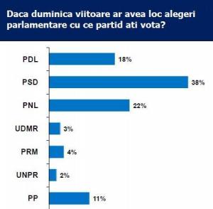 Dacă maine ar avea loc alegeri, PSD ar obţine primul loc, pe locul doi ar fi PNL, urmat de PD-L pe trei, iar pe patru ar fi Partidul Poporului. UDMR şi UNPR nu ar intra in Parlament.