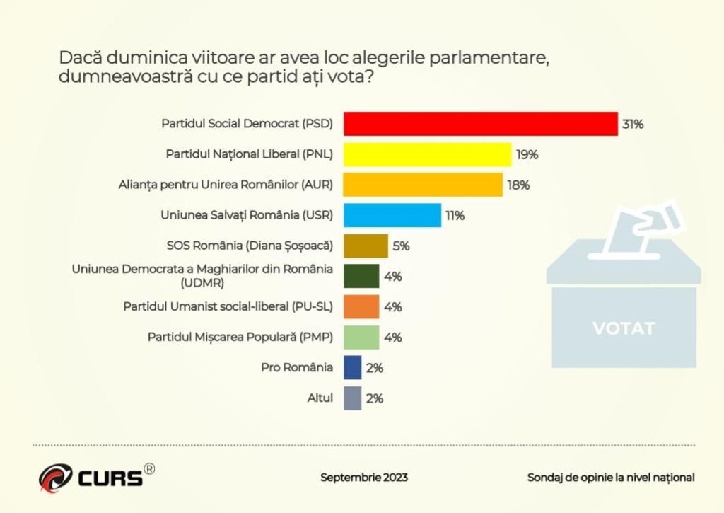 Dacă duminica viitoare ar avea loc alegeri parlamentare, câștigător ar ieși PSD, potrivit ultimului sondaj politic realizat de CURS la comanda PNL.