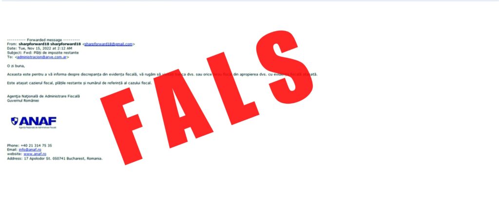 ”ANAF atenționează asupra unei noi campanii de mesaje false, transmise în numele instituției, prin care contribuabilii sunt informați despre <discrepanțe în evidența fiscală>. Mesajului îi este anexat un document, <evidența fiscală>, pe care vă sfătuim să nu îl deschideți! Reiterăm următoarele: NU deschideți aceste emailuri și NU accesați documentele anexate sau linkurile din conținut; nu transmiteți bani către conturile menționate! Serviciul Spațiul Privat Virtual, pus la dispoziția contribuabililor, gratuit, a fost creat și dezvoltat pentru o comunicare securizată cu instituția. De asemenea, contribuabilii pot obține informații fiscale cu caracter general la CALL CENTER ANAF 031.403.91.60”, transmit reprezentanții ANAF.