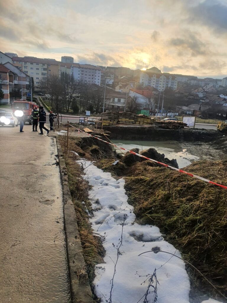 Ajunse la fața locului, echipele de intervenție au constatat că este vorba despre surparea terenului într-o zonă unde au început lucrările pentru fundația unui bloc. Alunecarea de teren s-a produs chiar la marginea drumului de acces în zonă.