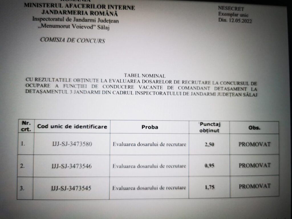 Evaluarea dosarelor, așa cum am arătat mai sus, s-a soldat cu note, cea mai mare fiind 2,50. Practic, candidatul cu această notă pare să pornească cu prima șansă în ocuparea funcției de Comandant. Așa cum se arată pe site-ul IJJ Sălaj, evaluarea dosarelor ”are drept scop aprecierea, cuantificarea şi valorificarea în procesul de selecţie a experienţei profesionale a candidaţilor, a conduitei şi evoluţiei în carieră, precum şi a cunoştinţelor profesionale dobândite prin diverse forme de pregătire, cu utilitate directă, pentru îndeplinirea eficientă a