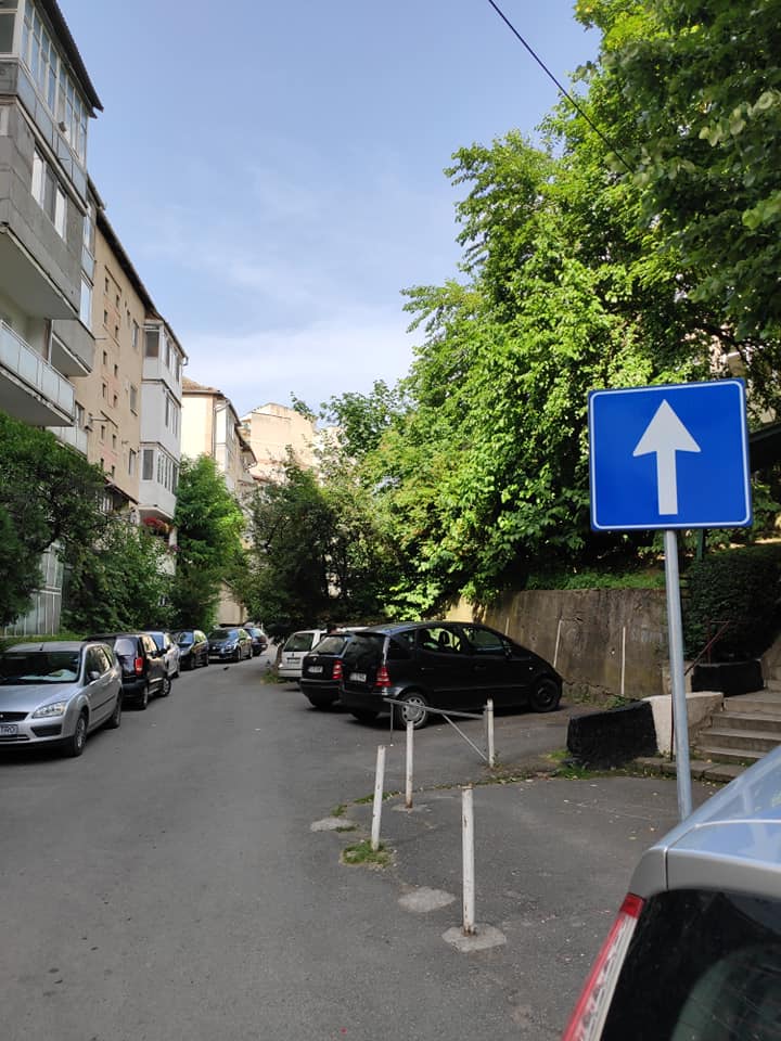 „Oare cine a venit cu ideea să se facă drum cu sens unic pe aleea dintre blocurile L și școala Gh. Lazăr? (desigur fără consultarea locatarilor!) Când au montat semnul nu li s-o părut ciudat că toate mașinile parcate pe stânga sunt cu botul spre ei? Înțeleg eu că dimineața e jale cu toți părinții care-și aduc copii la școală cu mașina, dar hai să ne gândim un pic să rezolvăm problema cu capul…După cum se vede din poză, locatarii (și nu numai!) parchează lângă blocuri cu partea dreapta al mașinilor lipite de perete, să poată ieși șoferul și să lase cât mai mult loc pentru a trece și alți participanți la trafic. De acum va trebui să parcheze invers, deci lățimea aleei va fi mai mică cu cel puțin 50 cm (dacă parchezi ok). Deci mai trec pe acolo SUV-urile care lasă copii la școală pe două roți laterale, eventual…Și haosul va fi și mai mare! Inversați sensul și se rezolvă problema! Locatarii continuă să parcheze normal și n-o să se creeze haos, iar pentru părinții care-și lasă copiii la școală este mai mult spatiu să se formeze coloană de așteptare (aprox. 50 m) față de situația de până acum, când se forma coloană de pe Tudor Vladimirescu și se bloca intersecția!”, adaugă cetățeanul.