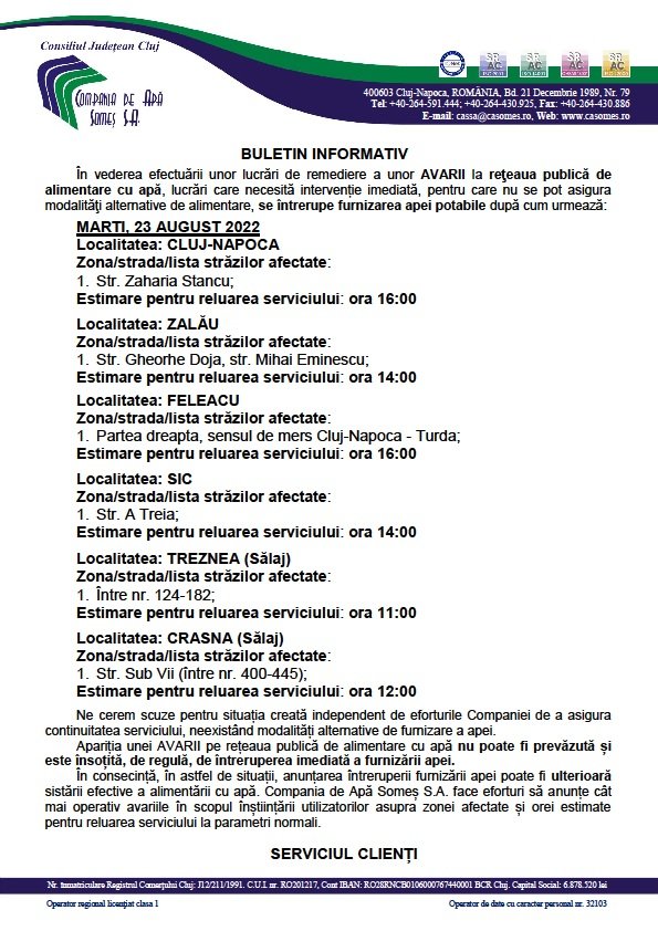 Anunț privind întreruperea furnizării apei potabile ca urmare a unor avarii, valabil pentru data de 23 August 2022 în municipiile Cluj-Napoca și Zalău și localitățile Feleacu, Sic, Crasna și Treznea (anunț actualizat)