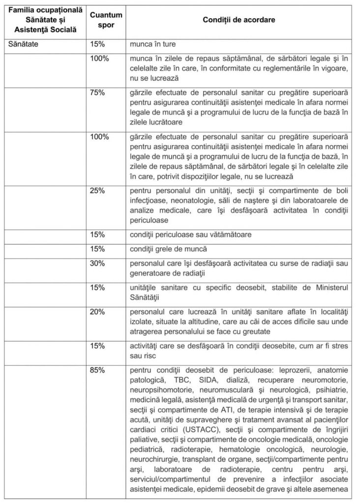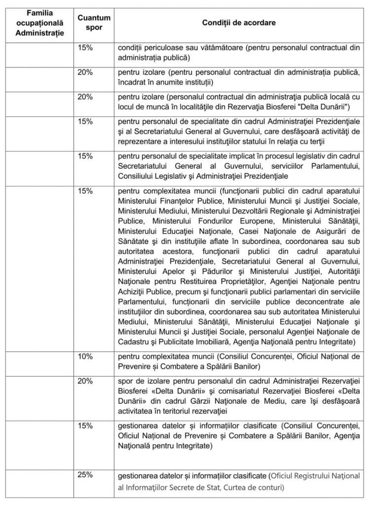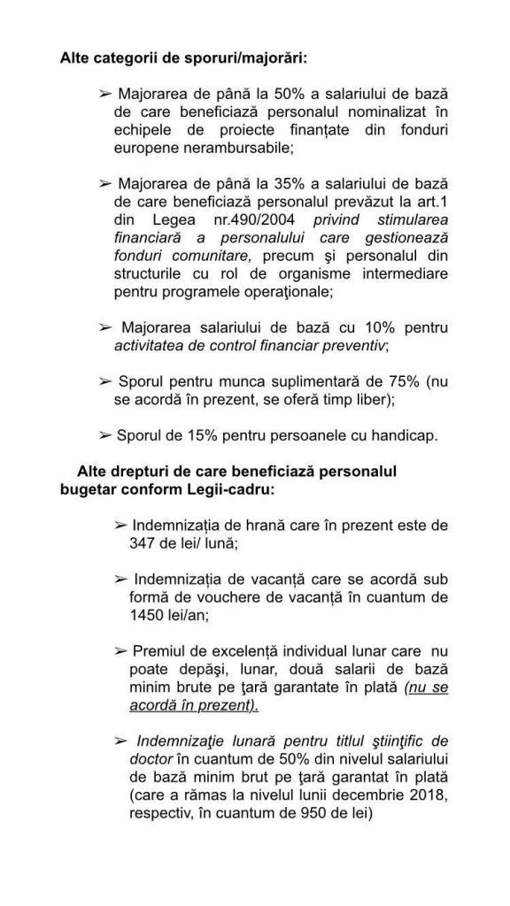 „7 familii ocupaționale de funcții bugetare (învățământ, sănătate și asistență socială, cultură, diplomație, justiție și Curtea Constituțională, apărare, ordine publică și securitate națională, administrație). Peste 50 de tipuri de sporuri (încă mai documentez) – de la spor pentru condiții de stres/suprasolicitare neuropsihică, la spor pentru munca în ture, spor pentru gestionarea informațiilor clasificate sau pentru păstrarea confidențialității. Și vechimea în muncă aduce o majorare a salariului la nivelul posturilor cu aceleași cerințe/responsabilități. Și dacă ești nominalizat în proiecte din fonduri europene ești avantajat – primești o majorare a salariului de până la 50%. Personalul bugetar beneficiază și de indemnizație de hrană (347 lei/lună) și, desigur, de vouchere de vacanță”, spune fostul ministru.